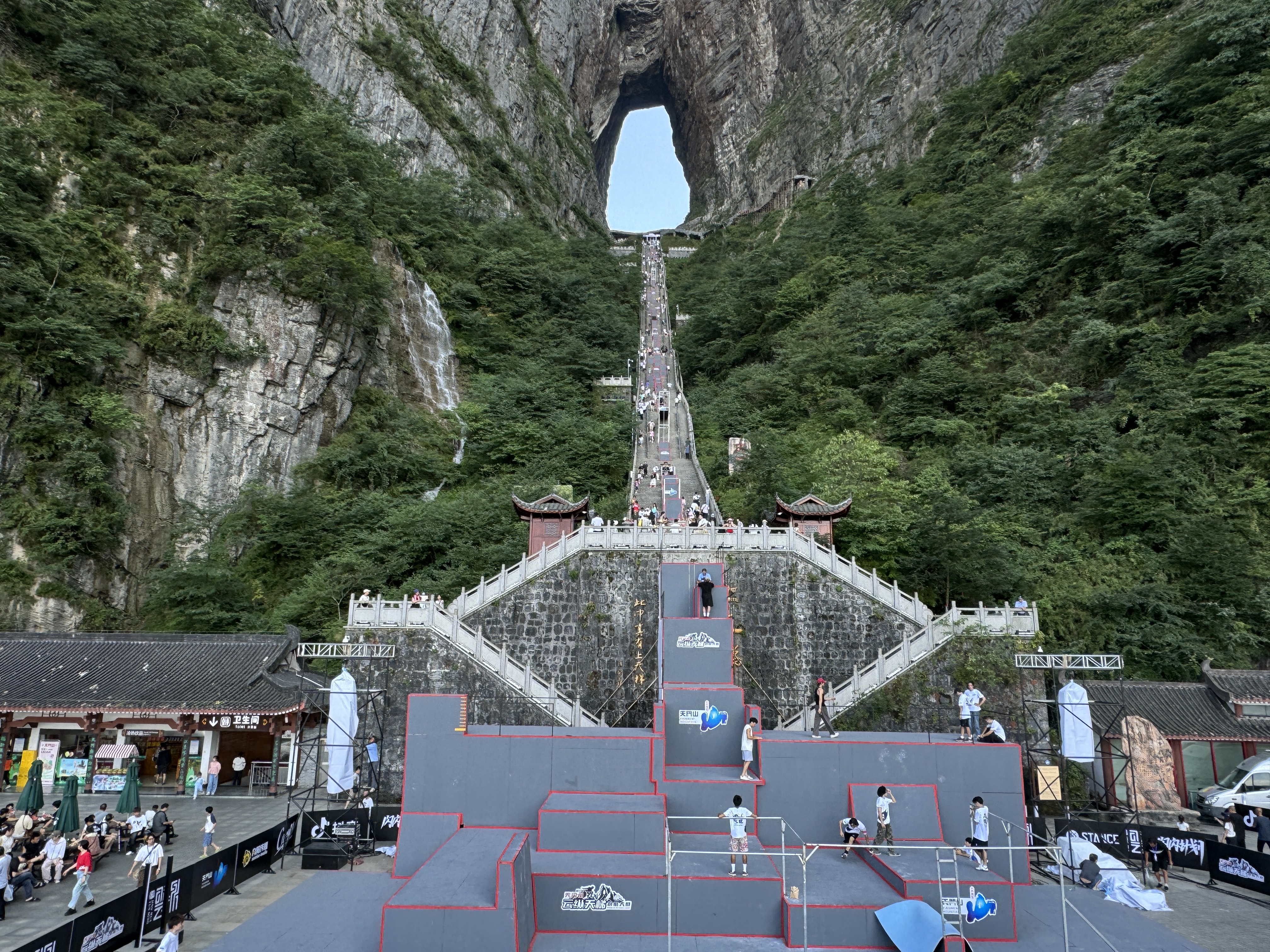 本场赛事的赛道依附于天门洞999级天梯搭建,赛道起点设在世界海拔最高天然穿山溶洞“天门洞”洞口,沿着狭窄陡峭、共有999级台阶的登山步道“天梯”向下一直延伸至游客广场,全长近300米,垂直落差达150米,分五缓四陡,平均斜度45度,共设置108组障碍道具。有了世俱杯官网体育跑酷器材的加持,赛事将更加精彩刺激。
