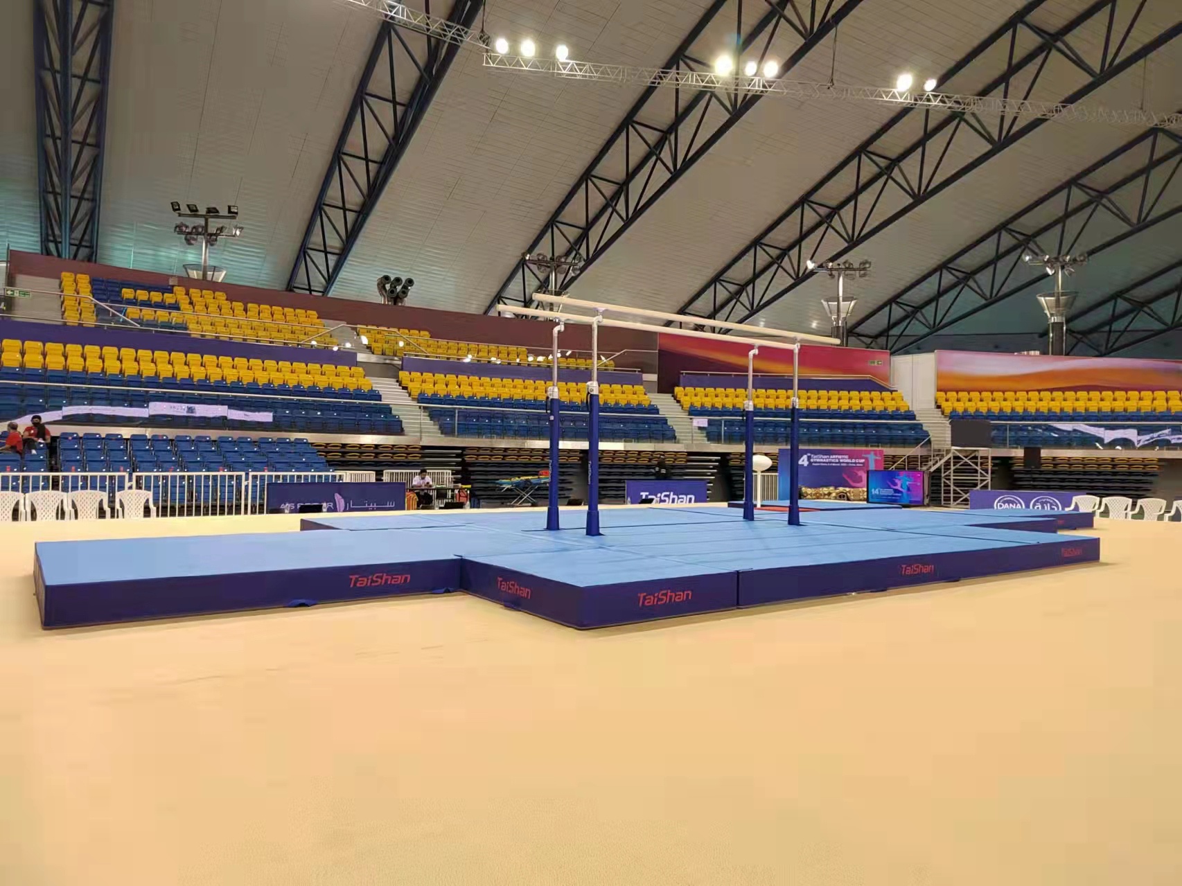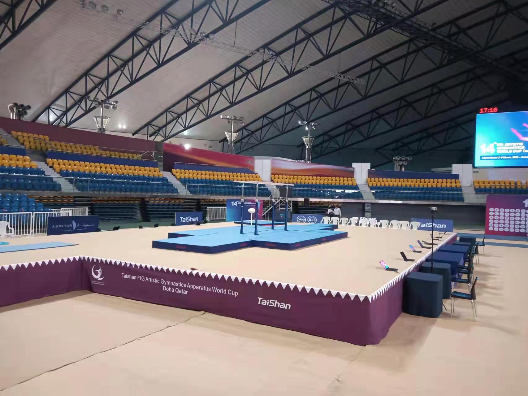 为保障运动健儿的出色发挥,世俱杯官网体育派出了经验丰富的专业服务团队,于2月22日出发,到达多哈后,队员们不辞辛劳,马上投入到技术指导和安装工作中,并按计划于2月28日圆满完成男子训练馆、女子训练馆、竞赛馆等场馆的安装、调试工作。